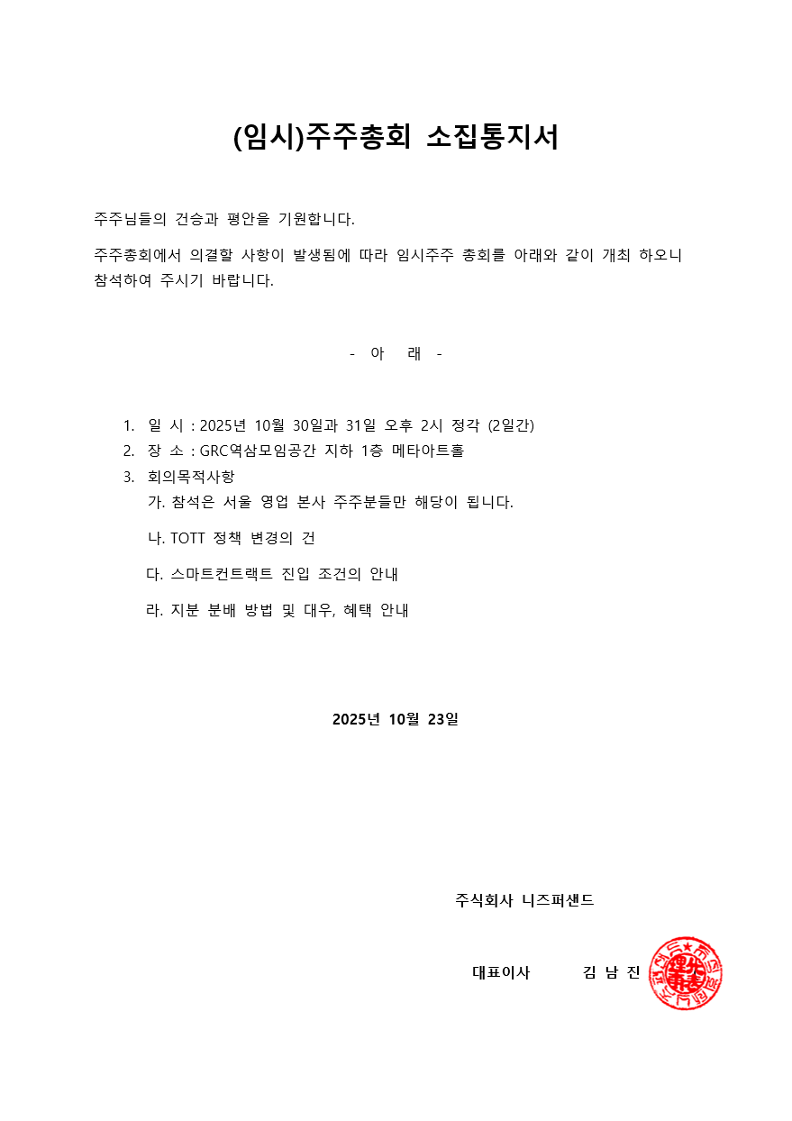 2025년 10월 30일(수)과 31일(목) 양일간 개최된 서울 임시주주총회가 성황리에 마무리되었기에 그 결과를 아래와 같이 공지드립니다.